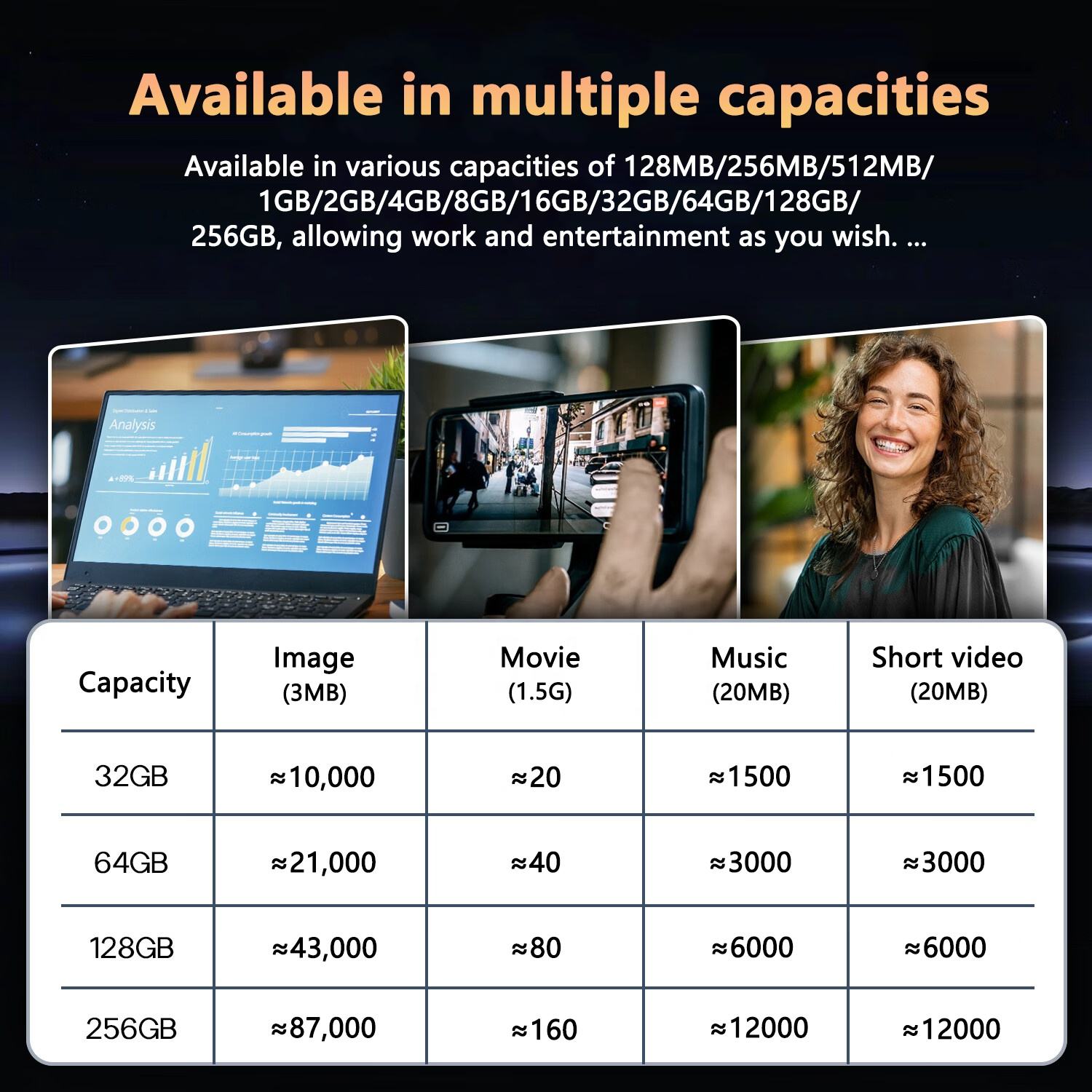 • Capacities: 128MB, 256MB, 512MB, 1GB, 2GB, 4GB, 8GB, 16GB, 32GB, 64GB, 128GB, 256GB